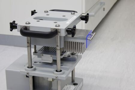 Development of the CrushExpress for crushing plant material for the flow cytometry (legal protection of registered design in 1999). With the CrushExpress 96 samples (plants, seeds, food samples) can be crushed simultaneously in regular deep well plates.